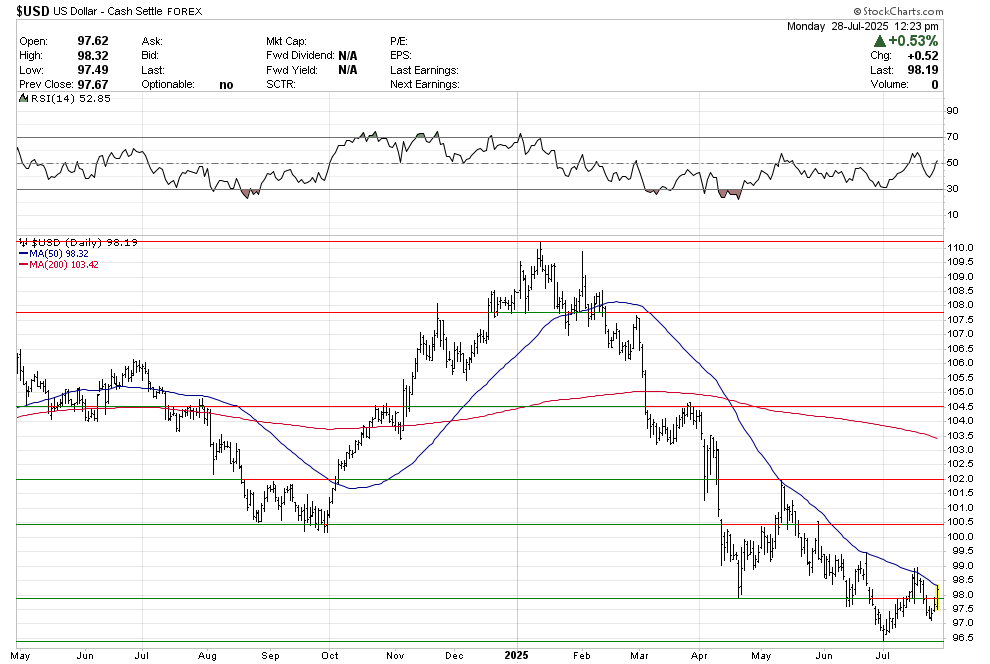 U.S. Dollar - I really like the odds of a dollar counter rally here. The greenback has been under pressure for about 6 months, and a breakout this week over the 50-day SMA could create a move to $99 and even top the $100 if this potential counter rally gets legs. One way to play this would be to buy UUP, which tracks the index, or a more advanced method would be to buy a currency pair.