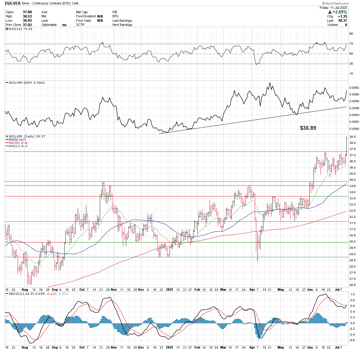 $Silver - Broke higher in a big way last week and has been clawing back some relative performance from gold, as is often the case later in the cycle. The 21-EMA has been supporting the price action of late and I expect this to continue and the commodity to stay north of the recent highs, just under $37.50 on any pullback in the short-term.