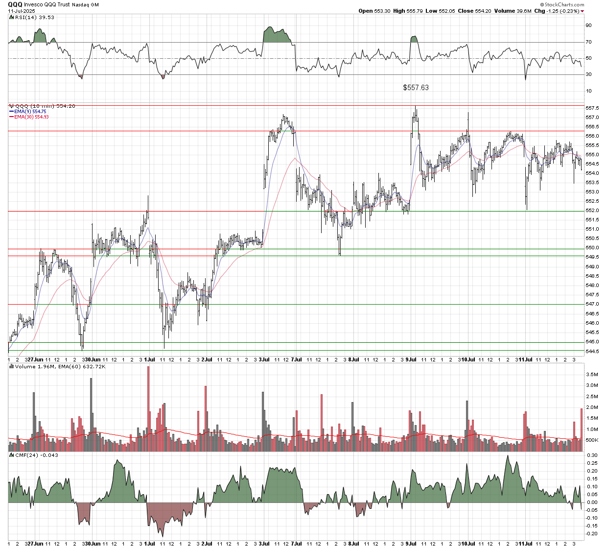 QQQ Trust (QQQ) - Recent highs are at $557.63, with an area around $556.25 resistance, as if we get over this area, we could trade at new all-time highs or at minimum a test of them. The Support area is around $550/$552, which I expect to be active today providing support or at minimum a gravitational pull. If we are to break $550, it could be a signal of a more serious pullback in the works, with $545 being an important support level as we would get close top the previous highs from earlier this year just under $541.