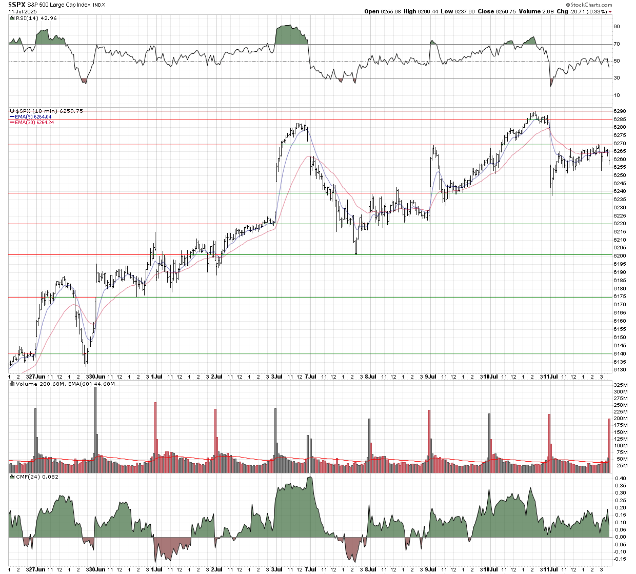 S&P 500 ($SPX) - Always like to break down the indices a bit more before the week starts, and this is a ten-minute chart over the last few weeks. There is an area of resistance overhead at $6270 with $6285/$6290 being the recent highs. There may be good support through and possibly above the $6220 and $6240 areas. Then below there could be possible to support at $6200, $6175, and $6140/$6150. With the 21 EMA on the daily, which is not pictured at $6144.53 to start the week.